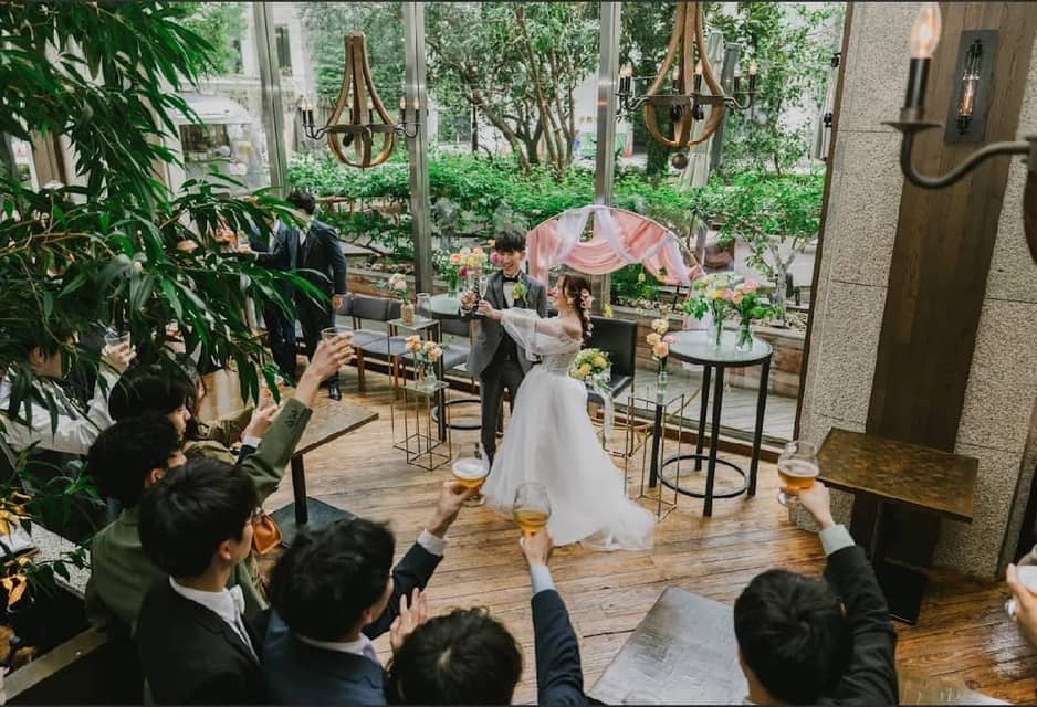 屋内とテラスがひと続きになった開放的なレストランなら、移りゆく季節を五感で楽しむ贅沢なウェディングが叶います